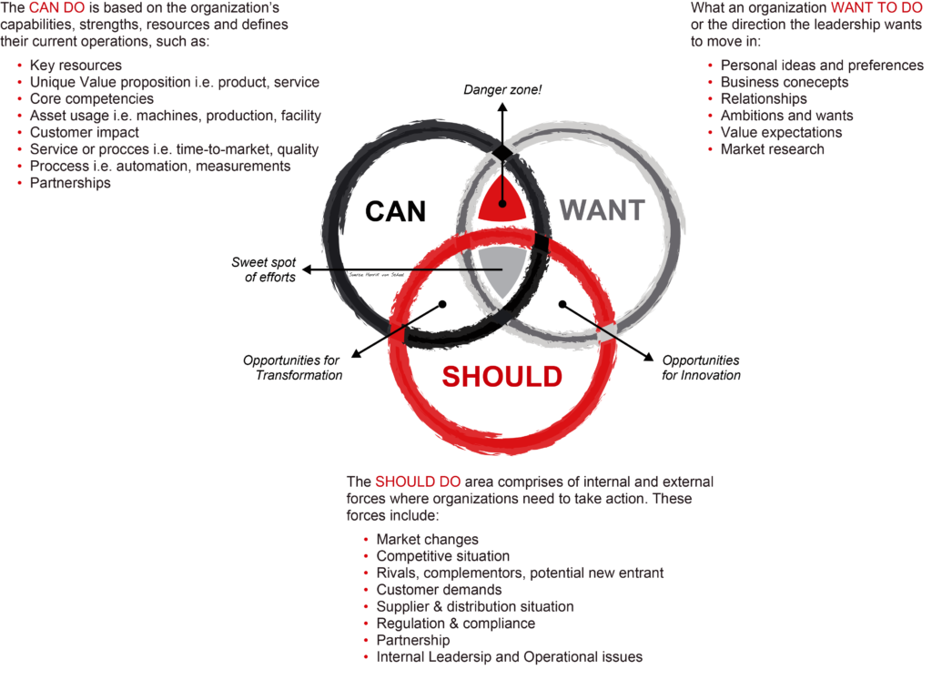 3. The right balance between Innovation & Transformation. The CAN-WANT-SHOULD do model identifies where and when to apply transformation or innovation principles in an organization. Best known and used as a strategic outcome driven or strategy executive approach. The aproach is famed to have structure the think of the Germany´s digital agenda in 2009 and is widely apply by leadership team.